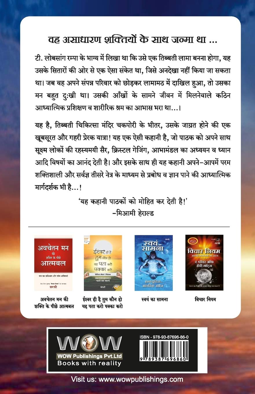 The Third Eye in Hindi – by T. Lobsang Rampa वह असाधारण शक्तियों के साथ जन्मा था … टी. लोबसांग रम्पा के भाग्य में लिखा था कि उसे एक तिब्बती लामा बनना होगा, यह उसके सितारों की ओर से एक ऐसा संकेत था, जिसे अनदेखा नहीं किया जा सकता था। जब वह अपने संपन्न परिवार को छोड़कर लामामठ में दाखिल हुआ, तो उसका मन बहुत दु:खी था। उसकी आँखों के सामने जीवन में मिलनेवाले कठिन आध्यात्मिक प्रशिक्षण व शारीरिक श्रम का आभास भरा था…। यह है, तिब्बती चिकित्सा मंदिर चकपोरी के भीतर, उसके जाग्रत होने की एक खूबसूरत और गहरी प्रेरक यात्रा! यह एक ऐसी कहानी है, जो पाठक को अपने साथ सूक्ष्म लोकों की रहस्यमयी सैर, क्रिस्टल गेजिंग, आभामंडल का अध्ययन व ध्यान आदि विषयों का आनंद देती है। और इसके साथ ही यह कहानी अपने-आपमें परम शक्तिशाली और सर्वज्ञ तीसरे नेत्र के माध्यम से प्रबोध व ज्ञान पाने की आध्यात्मिक मार्गदर्शक भी है…! ‘यह कहानी पाठकों को मोहित कर देती है!’ -मिआमी हेराल्ड About the Book in English: Lampa was preordained to be a Tibetan priest, a sign from the stars that could not be ignored. When he left his wealthy home to enter the monastery, his heart was filled with trepidation, with only a slight knowledge of the rigorous spiritual training and physical ordeal that awaited him . . . . This is his story, a hauntingly beautiful and deeply inspiring journey of awakening within Chakpori Lamasery, the temple of Tibetan medicine. It is a moving tale of passage through the mystic arts of astral projection, crystal gazing, aura deciphering, meditation, and more, a spiritual guide of enlightenment and discovery through the opening of the all-powerful, the all-knowing . . . . “”Fascinates the reader!”” – Miami Herald About the Author: T. Lobsang Rampa linked the East to the West better than any other writer in history. His accounts of a multitude of spiritual, occult, and psychic phenomenon can be found in such works as The Third Eye, The Hermit, Chapters of Life, The Rampa Story, Feeding the Flame, My Visit to Venus, Tibetan Sage, and Twilight.