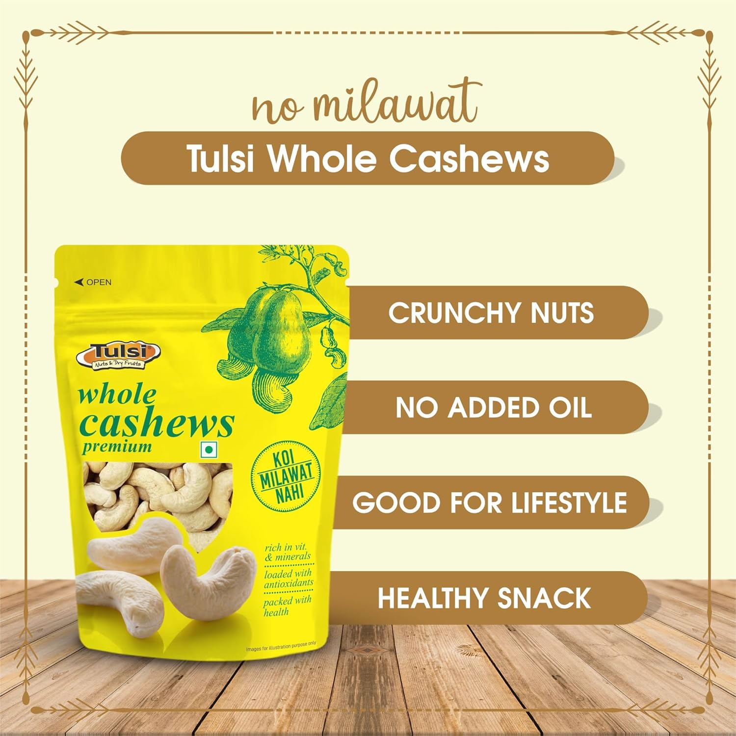 Indulge in the rich flavor of Tulsi Whole Cashew Premium, where each handpicked nut offers a delightful taste experience, perfect for satisfying your snack cravings anytime, anywhere.