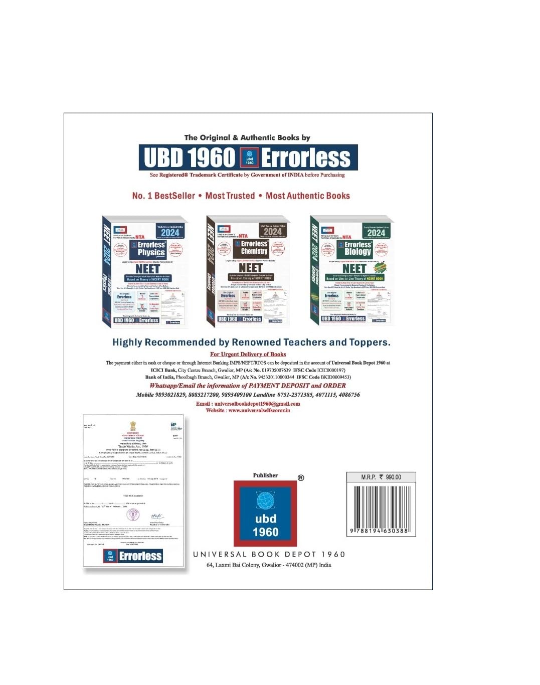 UBD1960 Errorless 36 Years Chapterwise solved Papers for Physics + Chemistry+ Biology for NEET New Edition 2024 by UBD1960 (Original Errorless with Trademark Certificate)