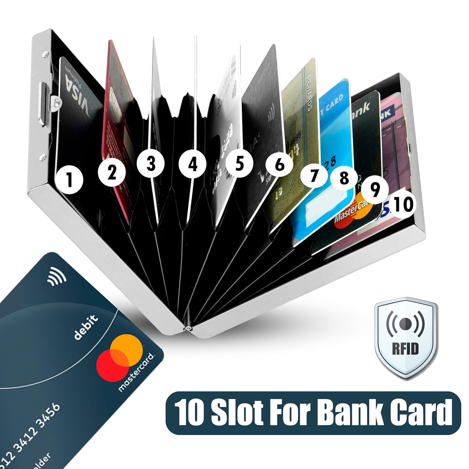 Number of card slots : 10 Slots, designed to hold driver’s license, ATM card, bank card and more. It can up to hold 10 cards , Dimensions: 9.5 X 6.5 X 2 cm.