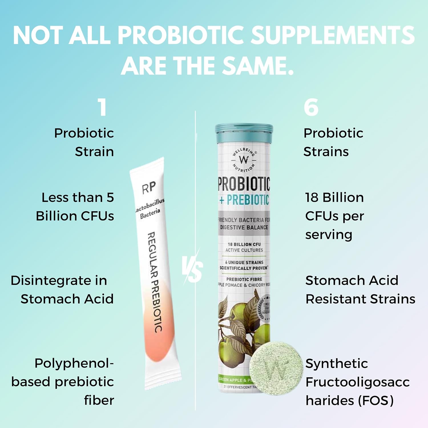 Wellbeing Nutrition Daily Probiotics + Prebiotics | Improve Metabolism, Acidity Relief, Digestion & Gut Health | 18 Billion CFU Organic Probiotics Supplement for Men & Women (21 Effervescent Tabs)