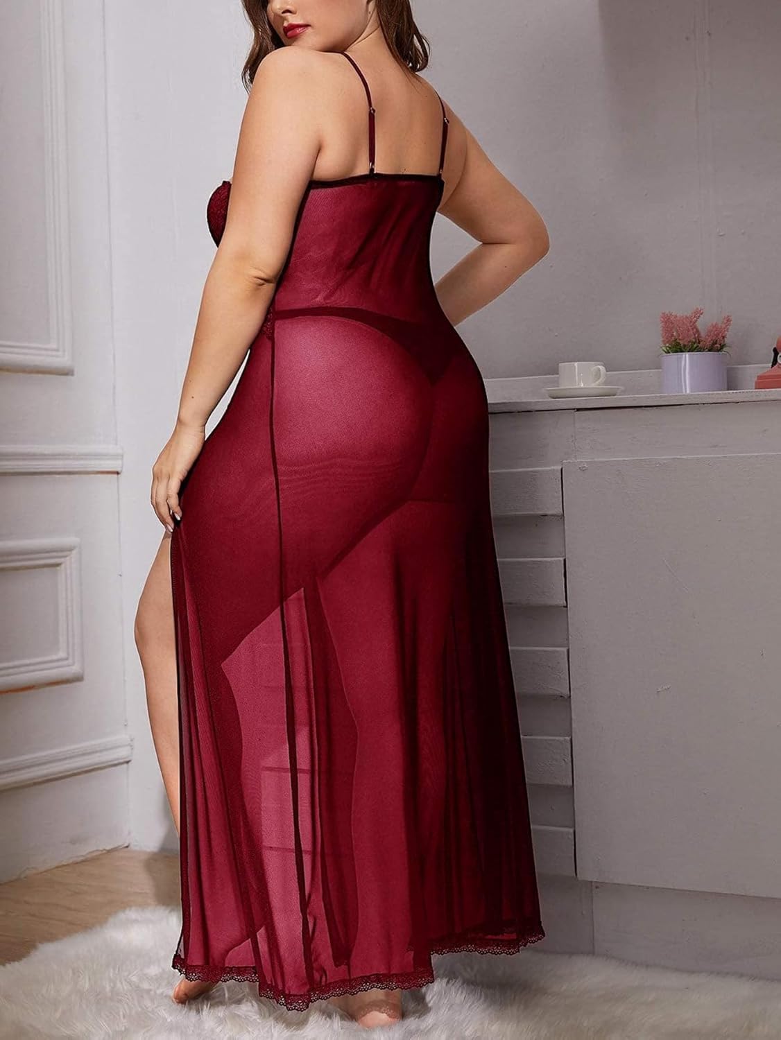 Xivir Women’s Plus Size Split Long Mesh Lingerie Dress Babydoll Chemise Sleepwear Side Slits