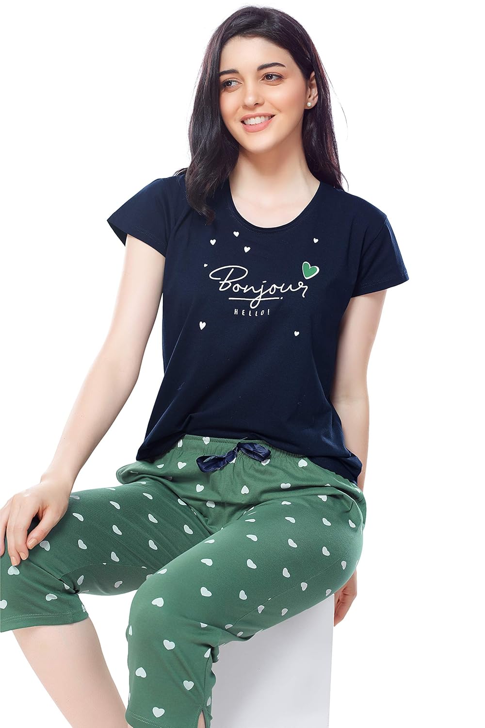 ZEYO Women’s Cotton Heart Printed Night Suit Set of Top & Capri 5233